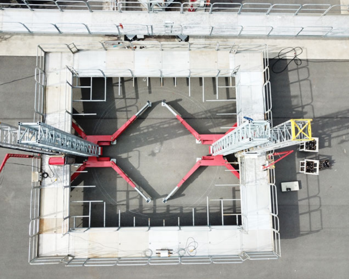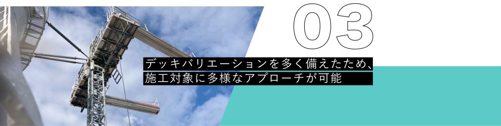 このデッキを連結することで橋脚や煙突を囲んだ形で⾜場を組むことが可能です。各種安全装置により安全で安定した作業⾜場となり、作業効率の向上が期待できます。
