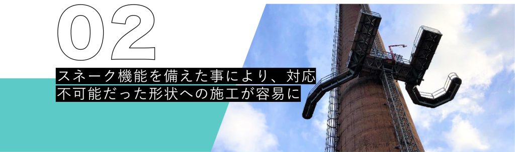 煙突、橋梁、⾵⼒発電、⾼炉、超⾼層ビル等、特殊形状構造物での使⽤に適しています。従来の機種では作業員の⼿が届かない部分も、柔軟性のあるスネークアタッチメントを使えば簡単に⼿が届くため、無理な体勢で作業をする必要がなくなり安全性も増します。